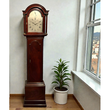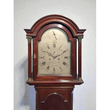 The well proportioned and substantially made case is made from solid and veneered mahogany. The plain base stands on a double plinth and the long trunk door is framed with reeded canted corners. The hood features Corinthian and Doric capitals to the separate reeded pillars and a broken arch top. The rear plain pillars displaying solid mahogany capitals.