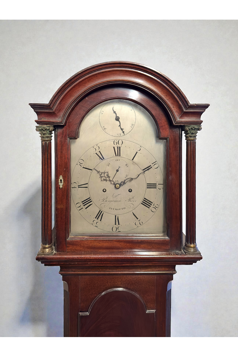 Featuring an 8 day movement and striking the hours on a bell. The arched silvered brass dial displaying Roman numerals, Arabic minutes and seconds. The lower centre of the dial engraved with the makers name Benjamin Reed, Plymouth. The dial also with an unusual and rare date dial to the top of the arch.